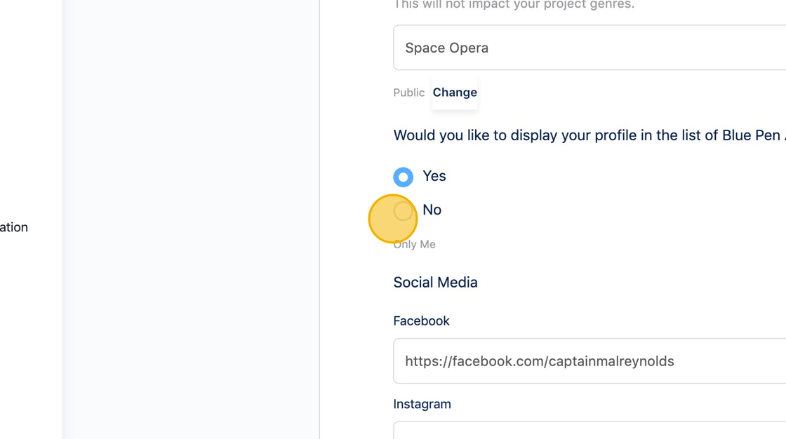By default, your author profile is visible publicly, including in the Blue Pen authors list. Authors can add their social media links and book links to their profile to gain exposure.